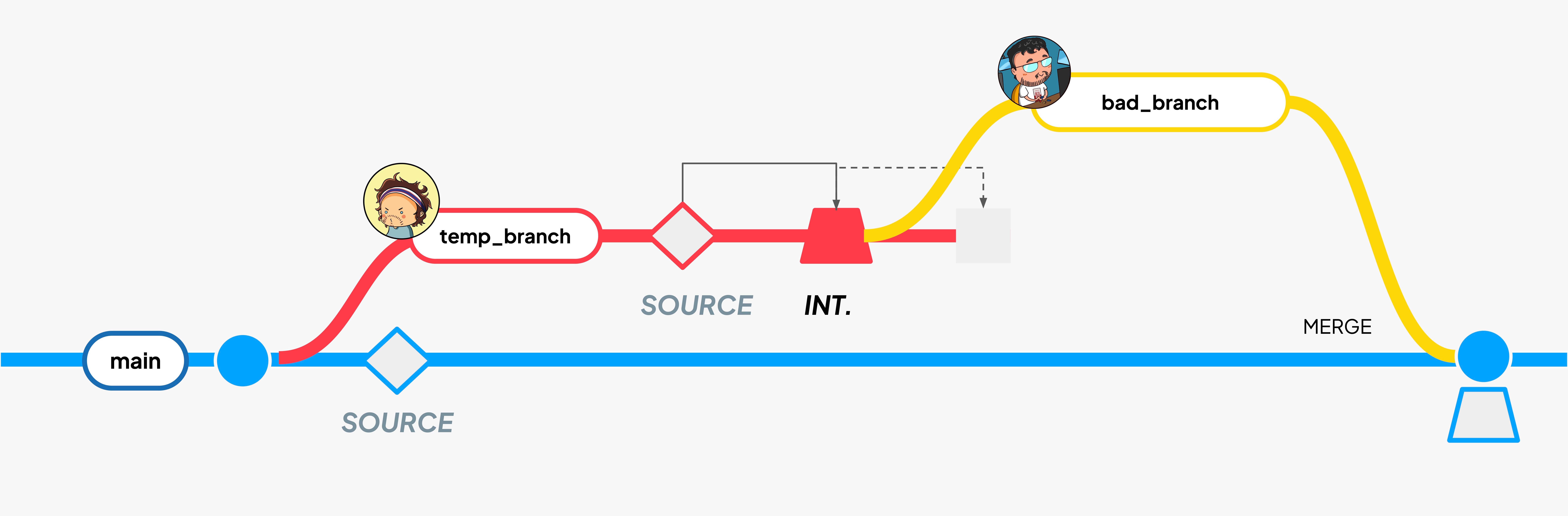 The problem appears if someone merges. If that branch were merged into main, production would move to a state that never existed in the pipeline logic with a mix of new intermediate results and old final outputs.