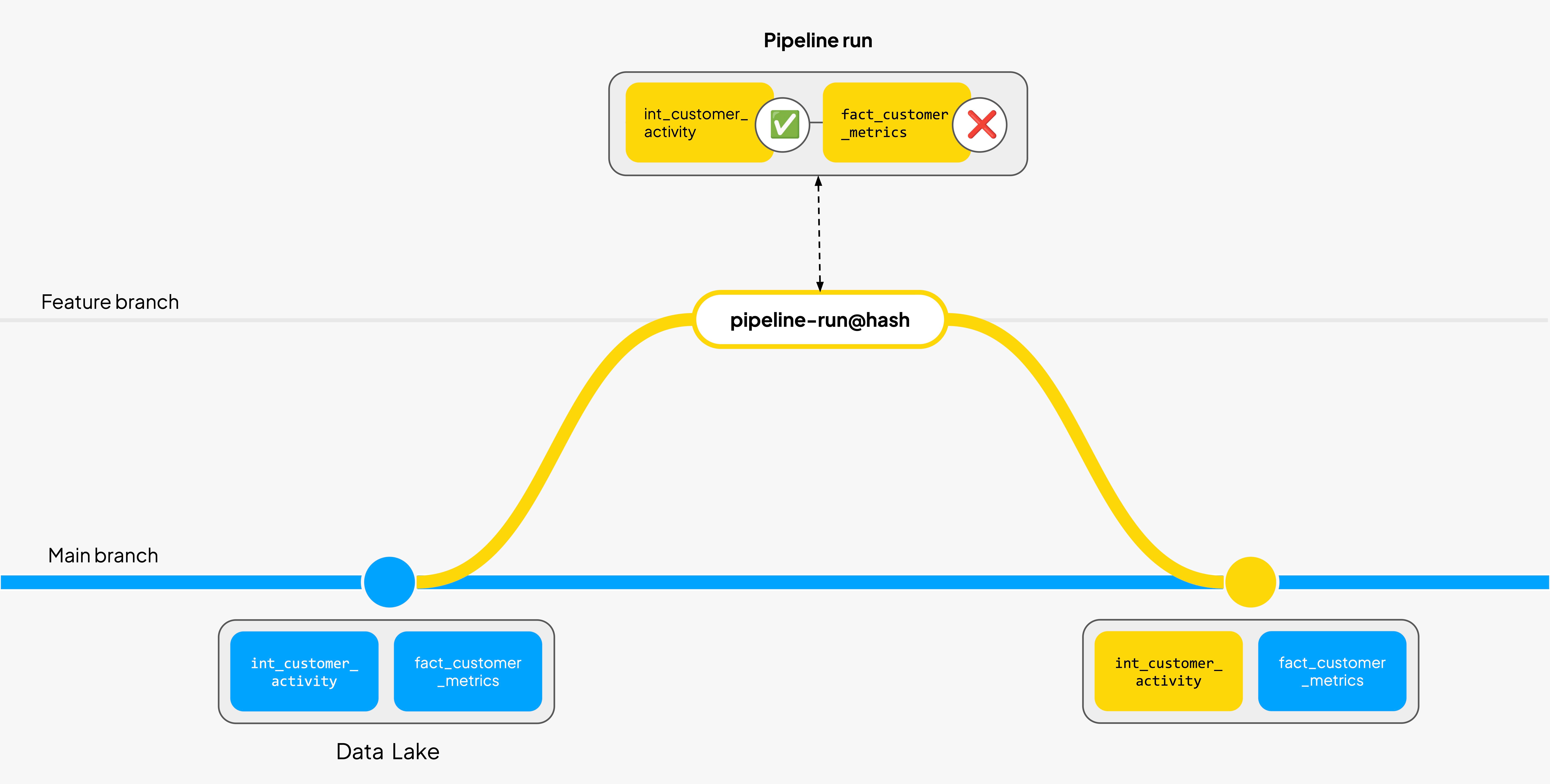 Imagine a team running a pipeline on a feature branch derived from main. The first step aggregates raw events into int_customer_activity, the second step produces the final table fact_customer_metrics. When the first step finishes, the branch now points to a new snapshot of int_customer_activity. Before the second step completes, a failure stops the run. Not ideal, but nothing catastrophic: from the branch / table perspective, there is nothing inconsistent here.